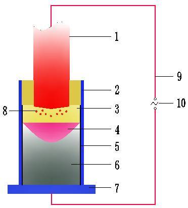 1-自耗電極;2-水冷結(jié)晶器;3-渣池;4-金屬熔池;5-渣殼;6-鋼錠;7-底水箱;8-金屬熔滴;9-變壓器;10-大電流導(dǎo)體8qd山東宏昇機(jī)械科技有限公司