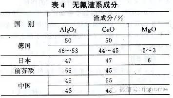 上述渣系均含有CaF2,據(jù)測(cè)試CaF270%+Al2O330%和CaF220%+Al2O340%+CaO40%的渣,氟的發(fā)散量分別為30~35mg/m3和12~18mg/m3。為了防止重熔中氟的揮發(fā)對(duì)環(huán)境的污染,近年來各國(guó)都致力于無(wú)氟渣的開發(fā),無(wú)氟渣基本上采用CaO-Al2O3渣系,有時(shí)加入少量的MgO。(表4)這種渣系具有較低的電導(dǎo)率,在1600℃時(shí),其電導(dǎo)率僅為CaF2-CaO-Al2O3渣的1/5,熔化速率可提高20%~40%,其生產(chǎn)率高,電0.耗低,而且無(wú)氟渣去氧、脫硫效果良好。但是無(wú)氟渣也存在著一些操作上的問題,如無(wú)氟渣熔點(diǎn)高,導(dǎo)電率低,引燃困難,需要液渣引燃;無(wú)氟渣的成分在CaO-Al2O3。共晶點(diǎn)附近,該共晶點(diǎn)液相線陡升,液渣成分稍有波動(dòng),渣熔點(diǎn)變化即很顯著,影響鑄錠成型,要求電渣輸入功率要穩(wěn)定,工藝操作不如氟化物渣系易于控制;無(wú)氟渣的電導(dǎo)率低,重熔時(shí)需要較高的工作電壓,影響爐前操作的安全,需采用大充填比重熔;另外無(wú)氟渣CaO含量高易吸水增氫等。因此,雖然無(wú)氟渣在防止污染和提高電渣重熔熱效率方面具有突出的優(yōu)越性,但仍處于試驗(yàn)階段。