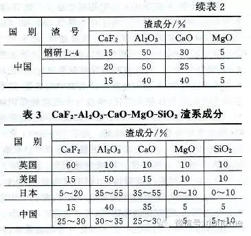 為了避免CaF2-Al2O3渣系的上述缺點(diǎn),近年來開發(fā)了CaF2-CaO-Al2O3三元渣系,CaF2-CaO-Al2O3-MgO四元渣系及CaF2-CaO-Al2O3-MgO-SiO2五元渣系等(見表1~表3)。這些渣系的成分基本選擇在三元共晶線上,渣的熔點(diǎn)較低,渣皮凝固時(shí)偏析現(xiàn)象較輕微,渣成分穩(wěn)定,鑄錠表面光潔,成型良好。而且這些渣系具有較低的電導(dǎo)率,提高了電效率,因渣中CaF2減少,造成的污染也有所減輕,渣中含少量MgO或SiO2,防止了鋼液吸氣,使鑄錠表面光潔。這些渣系的缺點(diǎn)是含有CaO,易于吸水,因此必須十分注意保持渣料的干燥,以防止鋼水吸氫增氧。