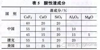 長(zhǎng)期以來,電渣重熔一直沿用堿性渣及中性渣,對(duì)渣中SiO2含量予以限制。為了適當(dāng)降低CaF2-CaO-Al2O3渣系熔渣氧離子活度,防止吸氫增氧,近年來開始在渣中加入SiO2,采用酸性渣以滿足工業(yè)發(fā)展的需要,其成分見表5。堿性渣脫磷脫硫效果良好,但它具有較高的透氣性,不可避免地將提高鋼中含氫量。隨著電渣重熔錠型的日益大型化,渣池與大氣接觸面積增加,電渣錠去氫問題日益尖銳。酸性渣雖不利于脫硫脫磷,但由于透氣性差,利于除氫。對(duì)于50~300t重的直徑1000~3000mm的大錠采用酸性渣(B<1)重熔,防止鋼中增氫效果明顯。用堿性渣重熔,氫會(huì)增至8cm3/100g,而用酸性渣重熔,則鋼中氫含量不超過2cm3/100g。另外,采用酸性渣重熔,可以改變鋼中非金屬夾雜物形態(tài)。用堿性渣重熔,鋼中夾雜物以剛玉為主(Al2O360%~90%,SiO2<20%),若用酸性渣重熔,鋼中夾雜物以硅酸鹽為主(SiO240%~60%,Al2O315%~20%),為塑性?shī)A雜物,而易于加工。但是,使用酸性渣必須解決其電導(dǎo)率低引起電渣過程不穩(wěn),以及重熔含有易氧化元素的鋼時(shí)其合金元素的燒損問題。